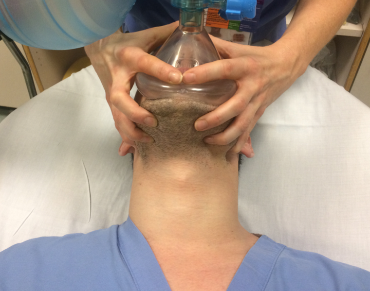 An alternate position is resting the clinician’s thenar eminences over the lateral aspect of the mask, while the mandible is lifted toward the mask itself, using the free digits to perform a chin lift or jaw thrust maneuver (see below). Care is taken in either techniques to use bony prominences to obtain mechanical advantage, rather than compressing soft tissue, which may obstruct and otherwise impair ventilation. In both techniques, the second provider stands to the side of the patient and squeezes the self-inflating bag to deliver oxygen at a clinically indicated respiratory rate.