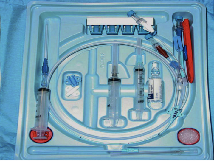 Figure 3. Central line kit for use with the Seldinger technique. Image courtesy of EMDocs. Used under the Creative Commons Attribution 4.0 International License. Original image located at: emDOCs.net – Emergency Medicine EducationUnlocking Common ED Procedures: Never Let Go - A Review of Central Venous Access Placement - emDOCs.net - Emergency Medicine Education.