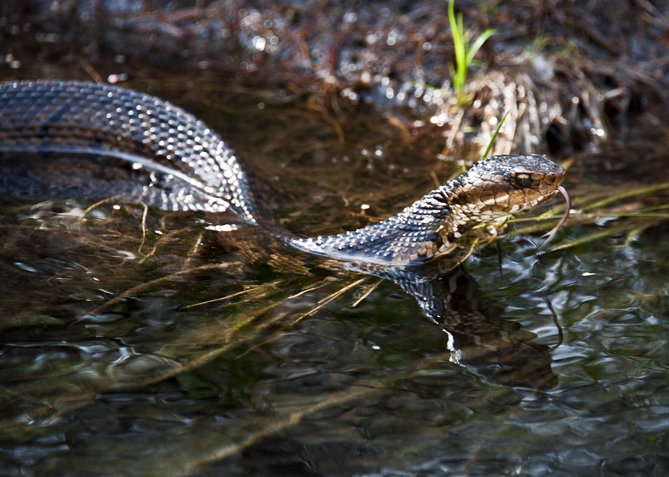 Figure 4. Water moccasin. Courtesy of pixabay. https://pixabay.com/photos/water-moccasin-snake-stream-nature-85609/.