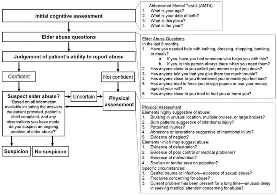 - Rosen T, Stern ME, Elman A, Mulcare MR. Identifying and initiating intervention for elder abuse and neglect in the Emergency Department. Clin Geriatr Med 2018;34:435-451.