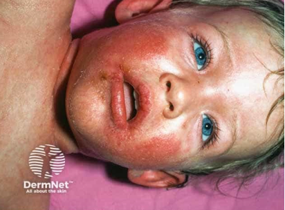 Figure: Sloughing of the skin around the mouth. Image courtesy of Dermnet. Used under the Creative Commons Attribution-NonCommercial-NoDerivs 3.0 (New Zealand).