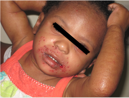 Figure: Note the eczema of arms and face with small ulcerative rash on an erythematous base around the mouth. Image courtesy of Dr. S. Margaret Paik. Used with permission.