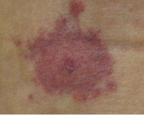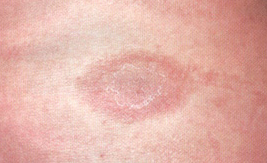 Figure: Herald's Patch. Note erythematous patch with central clearing. Image courtesy of Dermnet. Image used under the Creative Commons Attribution-NonCommercial-NoDerivs 3.0 (New Zealand).