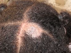 Figure: Tinea capitus. Note the patch of alopecia with black dots. Image used under the GNU Free Documentation license.