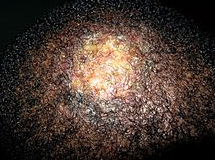 Figure: Kerion. Note the boggy erythematous appearance with associated alopecia. Image courtesy of Grook da Oger. Used under the licensia de documentación libre GNU.