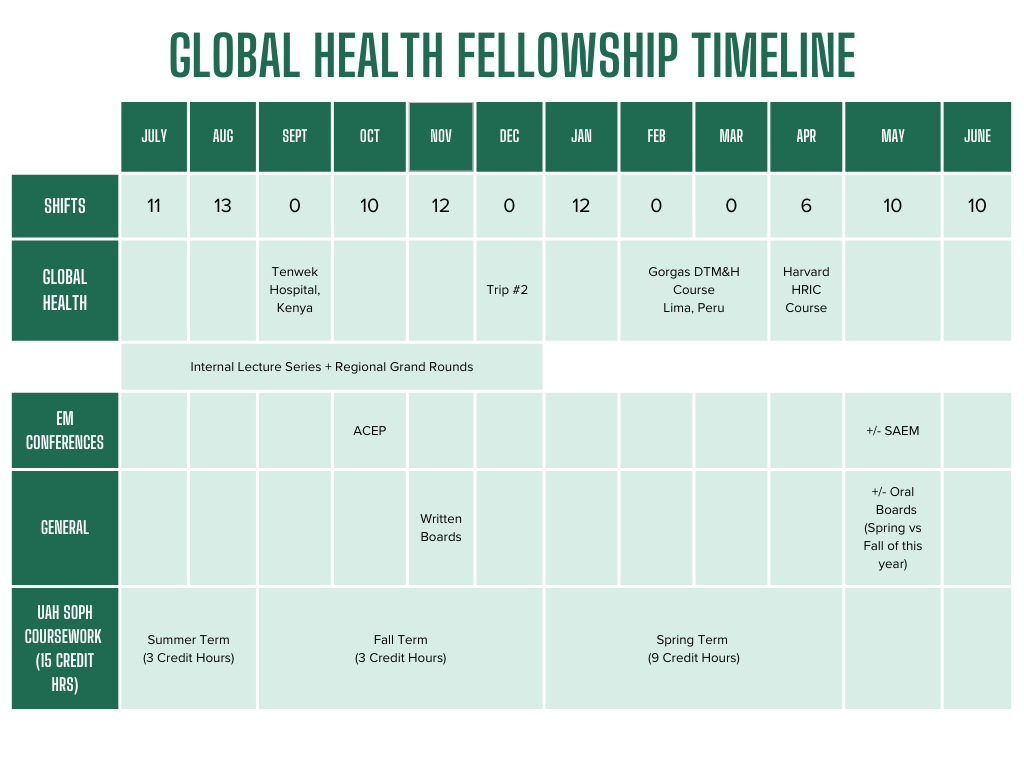 The Global Emergency Medicine fellowship can take place over one or two years. Those who choose to complete the fellowship in one year will earn a Global Health Certificate through the UAB School of Public Health. Those who choose to complete a two year fellowship will earn a master's degree in public health or equivalent.