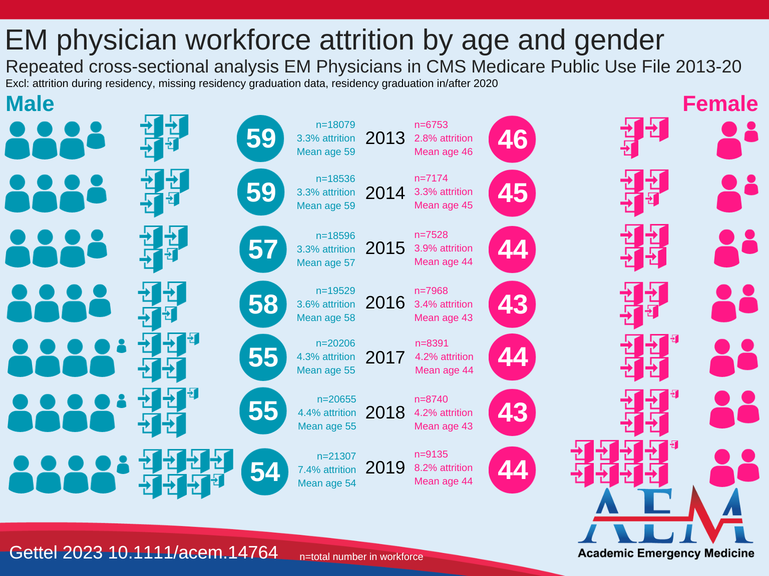 The data are stunning: “The 2319 EPs who exhibited attrition in 2019 had a median (IQR) age of 49.7 (40.6–62.8) years, stratified to 53.5 (43.5–65.3) years for male and 43.7 (37.8–52.8) years for female EPs.” This is a main finding from Gettel et al. in this month’s Pick of the Month (POTM) Emergency medicine physician workforce attrition differences by age and gender.Figure 3 in the article shows a more striking difference in the area under the curve for total years of practice between males versus females. Although it is tempting to speculate, this POTM announcement is not the correct venue, nor does its 59-year-old White male author have appropriate expertise to begin conjecturing reasons behind the why. The data in this article serve as a touchstone to galvanize a systematic health services research effort to find the why behind the decade of difference in age of exit between men and women.