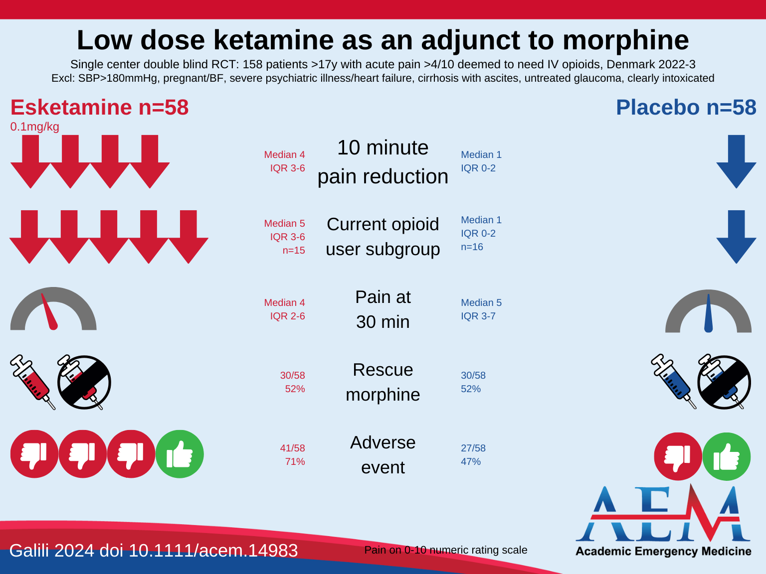 Now, for the first time, Stine Fjendbo Galili and colleagues have conducted a randomized, placebo-controlled trial that included a heterogeneous population of emergency department (ED) patients with pain. In this month’s POTM, Low-dose ketamine as an adjunct to morphine: A randomized controlled trial among patients with and without current opioid use, the authors found that compared with placebo, patients receiving 0.1 mg/kg of ketamine had significant reductions in pain scores for the subsequent 30 minutes.